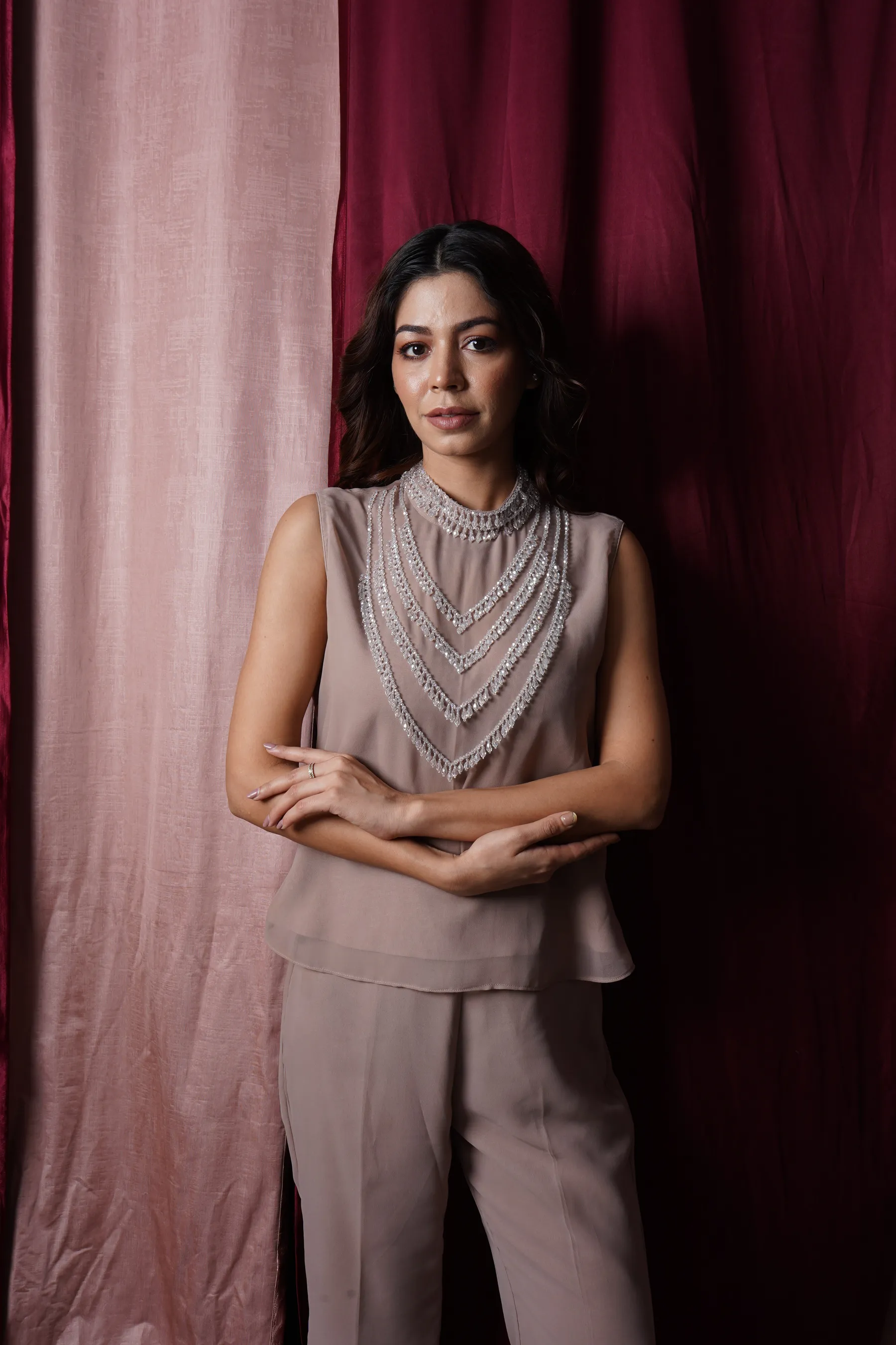 HighlightsHand embroideredMaterial usedCrystalsFabricGeorgetteWashing InstructionsNecklace SetCrafted in lightweight georgette, this taupe co-ord features a layered crystal neckline that gives a refined jewelry-inspired shine. The sleeveless silhouette keeps the look sleek, modern, and effortlessly elegant. Its soft pastel tone and fluid drape make it ideal for celebrations, parties, and evening gatherings. A polished, comfortable set designed for timeless festive style always. |